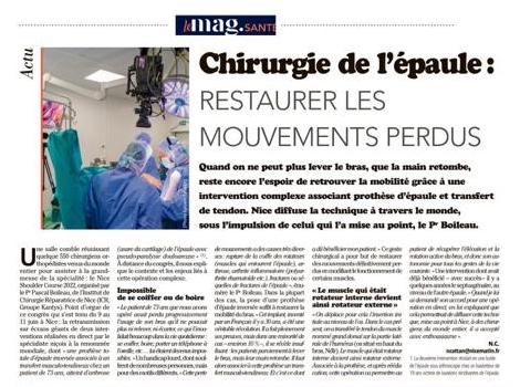 Chirurgie de l’épaule: restaurer les mouvements perdus Dans le Mag Santé de l’édition du dimanche 26 juin, le journal Nice-Matin vient de publier un article sur le Nice Shoulder Course