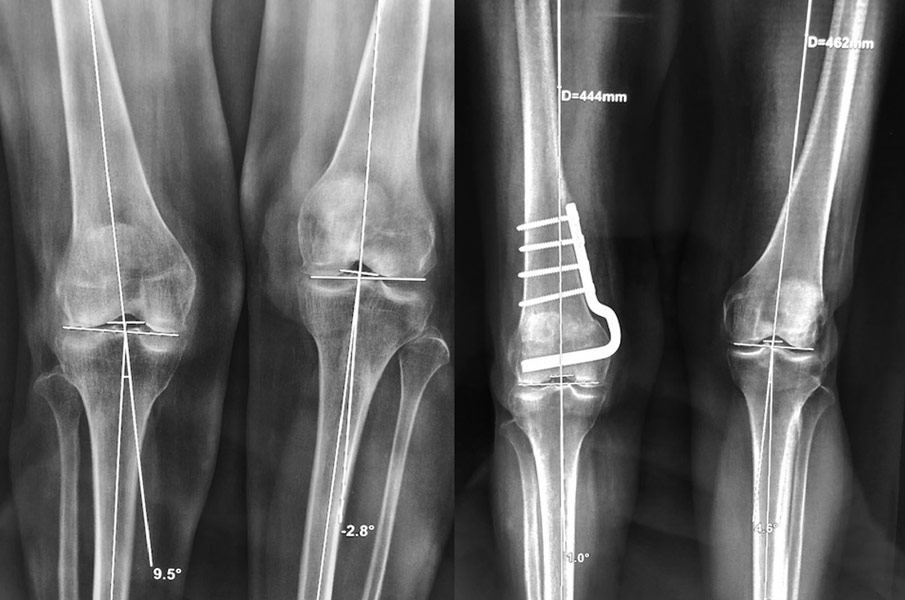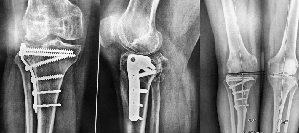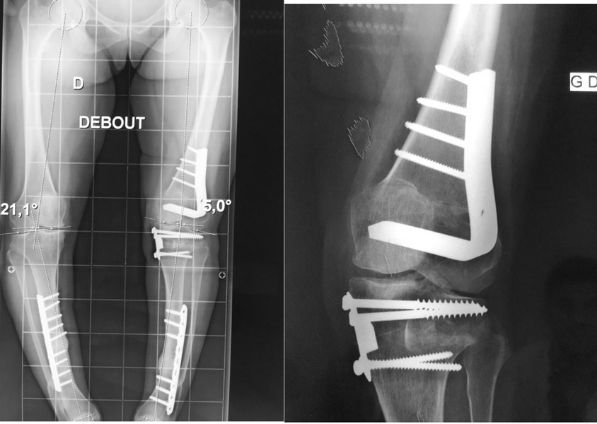 Double ostéotomie de vagisation lors de la même opération, au fémur par soustraction d’un coin d’os en externe, fixée avec une lame-plaque à 95° ; au tibia par ouverture interne (avec comblement par le coin d’os prélevé au fémur) fixée par une plaque.