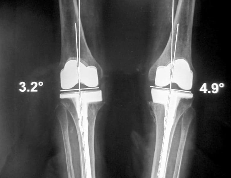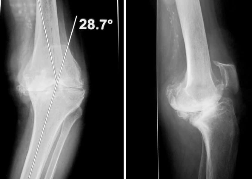 Déformation du genou en valgus (jambes en X), femme jeune (45 ans), ancienne handballeuse aux jeux de Séoul ; le fémur et le tibia sont déformés. Handicap majeur.