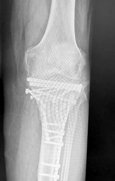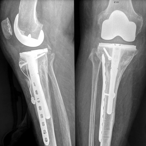 Homme 65 ans, Fracture complexe des 2 plateaux tibiaux opérée par plaques il y a 3 ans. Non consolidation osseuse.
