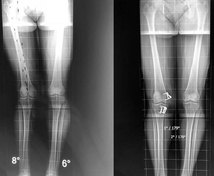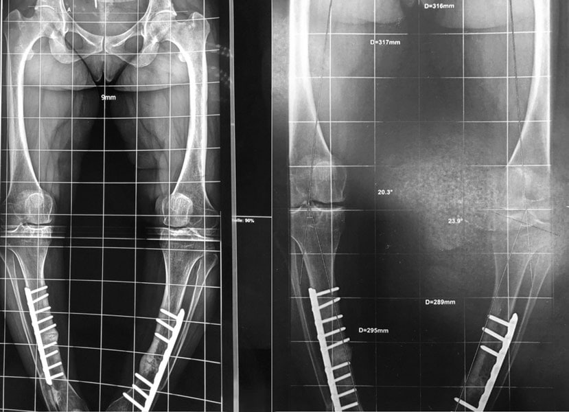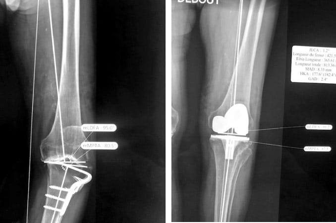 On réalise une double ostéotomie de varisation lors de la même opération, fémorale et tibiale, fixées avec des agrafes métalliques.