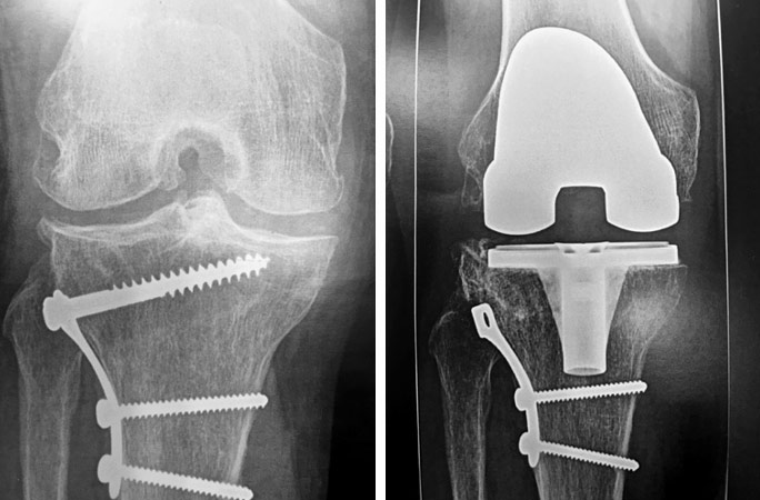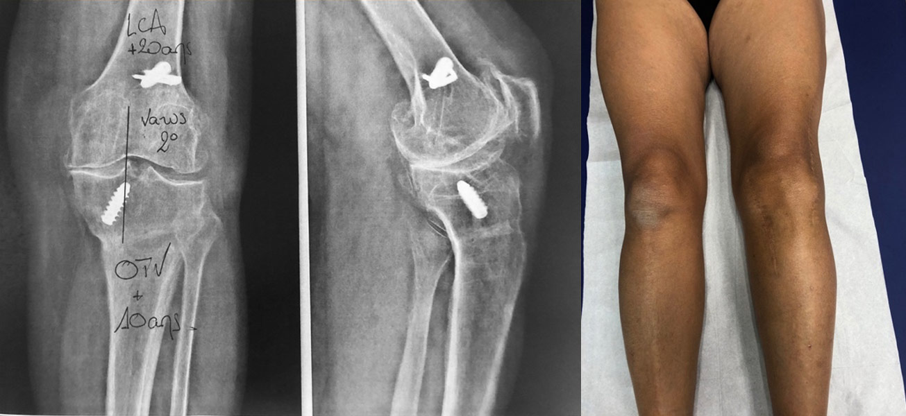 Homme 65 ans, Ostéotomie tibiale de valgisation il y a 15 ans.