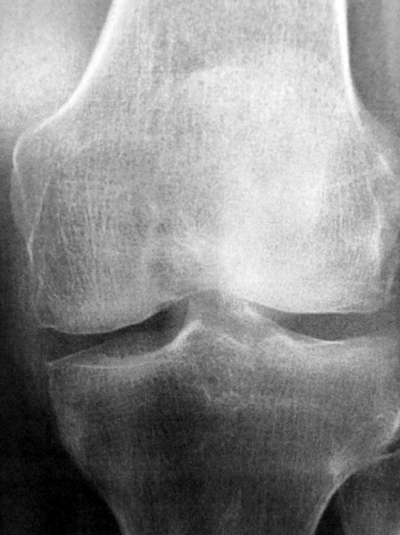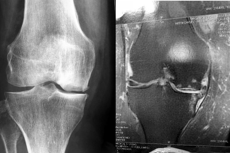 Arthrose interne (pincement à la radio) associée à une nécrose du condyle fémoral interne (visible à l’IRM). Homme, 65 ans.