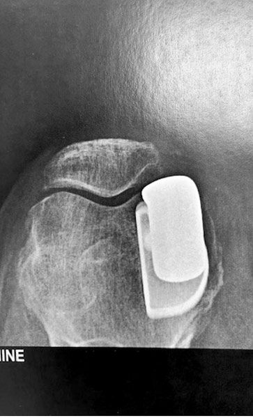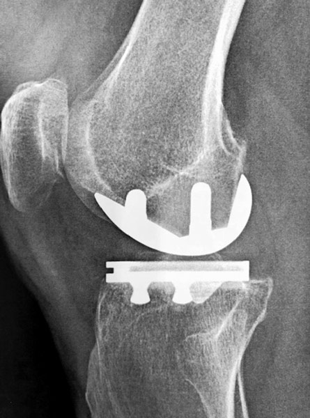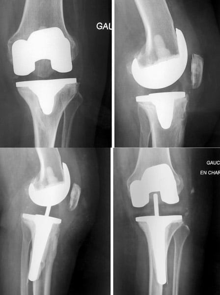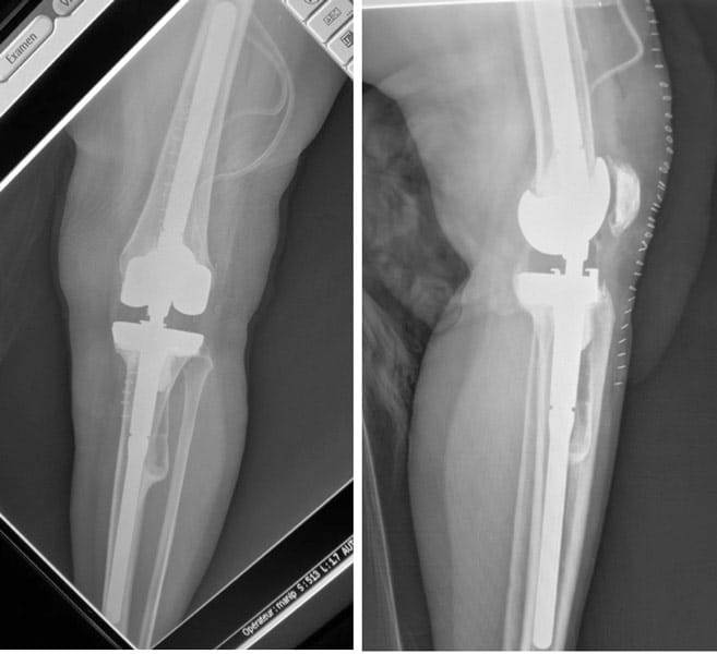 On propose une reprise chirurgicale : ablation du bouclier métallique trochléen, mise en place d’une prothèse totale du genou NexGen.