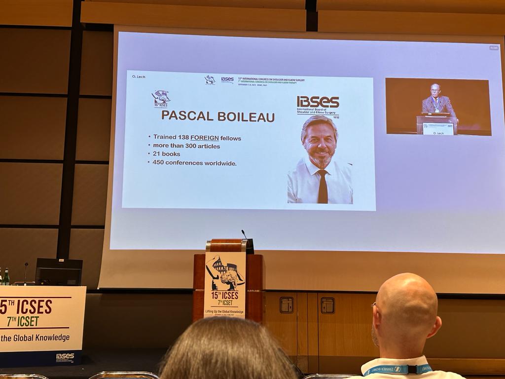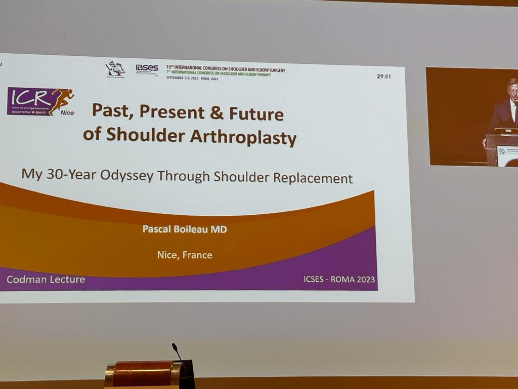 Le Dr Mikael Chelli a présenté le résultat de son travail sur la rotation interne après prothèse d’épaule inversée lors du congrès de l’ICSES.